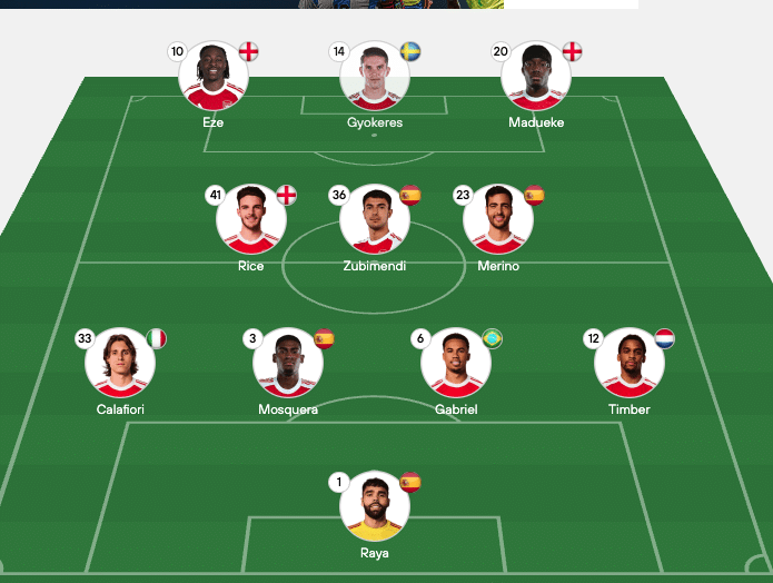 Cambios: Kepa Arrizabalaga, Setford, Myles Lewis-Skelly, William Saliba, Piero Hincapié, Christian Norgaard, Max Dowman, Ethan Nwaneri, Gabriel Martinelli, Leandro Trossard