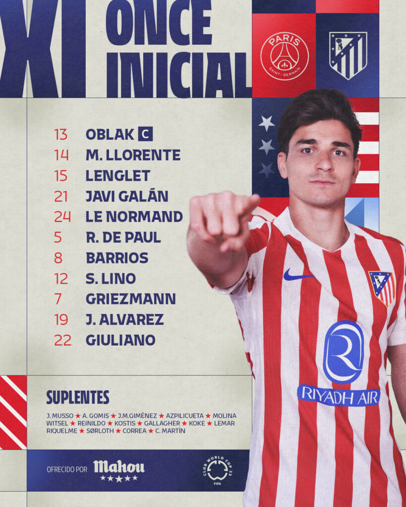 Estos son los once iniciales que dispone Diego Simeone para el estreno frente PSG, en la fecha inaugural del Grupo B del Mundial de Clubes 2025.