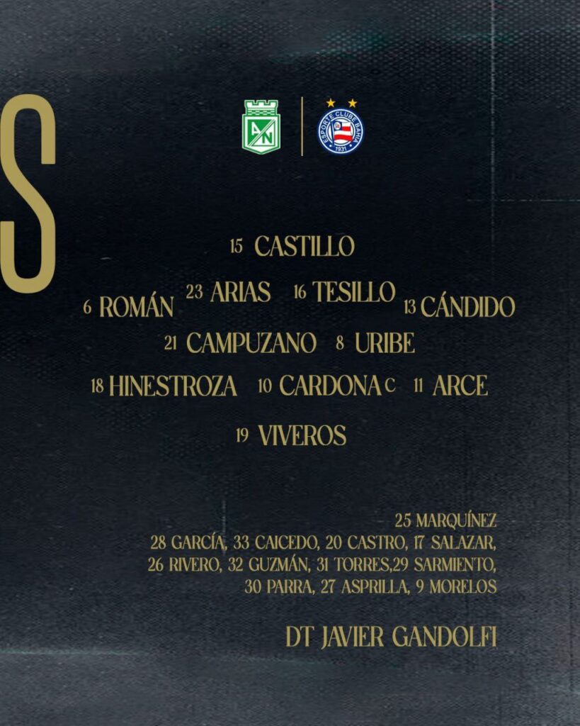 Atlético Nacional hoy: alineación vs Bahia por Copa Libertadores