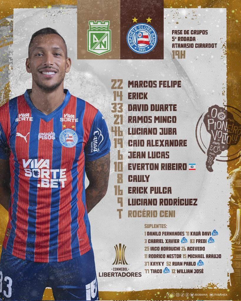 Bahia hoy: alineación vs Atlético Nacional por Copa Libertadores