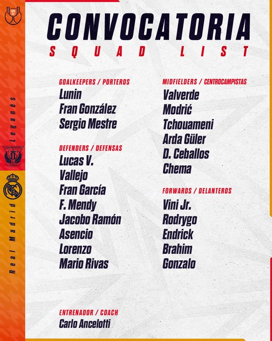 El Real Madrid ha anunciado su lista de convocados para el partido contra el Leganes correspondiente al partido de la Copa del Rey. El partido se jugará el miércoles 5 de febrero.