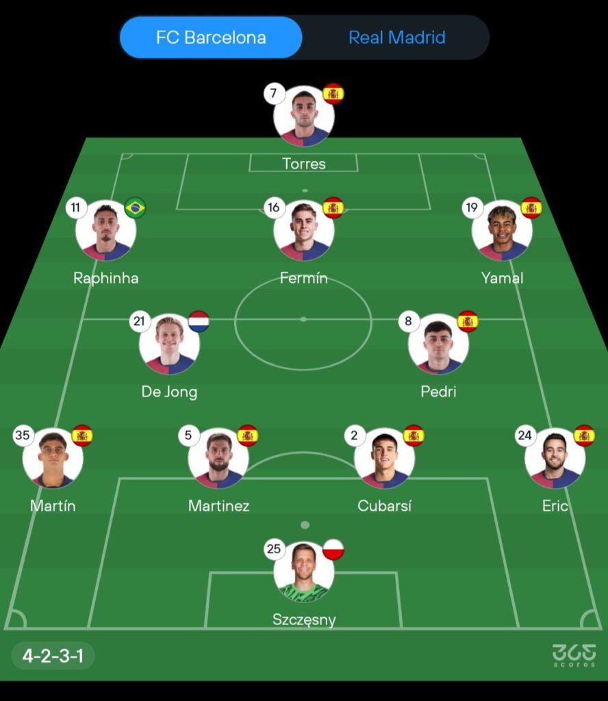 - Delanteros: Lamine Yamal, Raphinha, Ferran Torres.