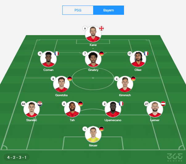 - Delanteros: Michael Olise, Harry Kane, Kingsley Coman.