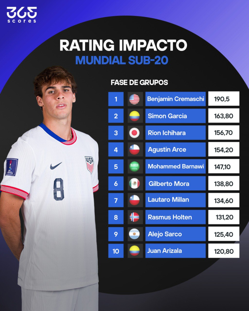 El futbolista estadounidense Benjamin Cremaschi fue el jugador más influyente de la fase de grupos del Mundial Sub-20 según el Rating de Impacto de 365Scores. Su rendimiento ofensivo y participación decisiva en el funcionamiento del equipo lo colocaron en la cima del ranking.
