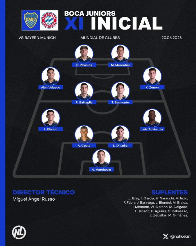 Estos son los once iniciales que dispone Miguel Ángel Russo para el segundo encuentro del Xeneize en este Mundial de Clubes 2025, enfrentando nada más ni nada menos que al histórico Bayern Munich, por el Grupo C.