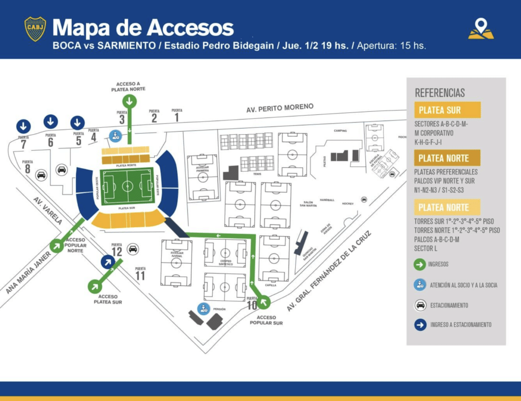 El club Xeneize dio a conocer cómo será el acceso de los hinchas y socios de Boca al Nuevo Gasómetro. Ingresarán a la platea cubierta desde la Perito Moreno. También por la calle Ana María Janer ingresarán los socios que van a la Popular Norte. A la Platea Sur del Ciclón se ingresará por la Avenida Varela y, los que ocuparán la Popular Sur ingresarán por Avenida Fernández de la Cruz.