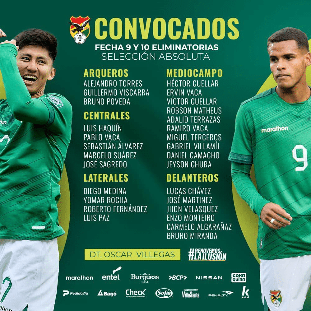 La ilusión de Bolivia está intacta. “La Verde” tiene una seria chance de estar en el próximo Mundial del 2026 y para eso, deberán sacar buenos puntos ante Colombia y Argentina en el Alto y en Buenos Aires respectivamente. Para aquello, Óscar Villegas presentó su lista de convocados para las Eliminatorias Sudamericanas del mes de octubre.