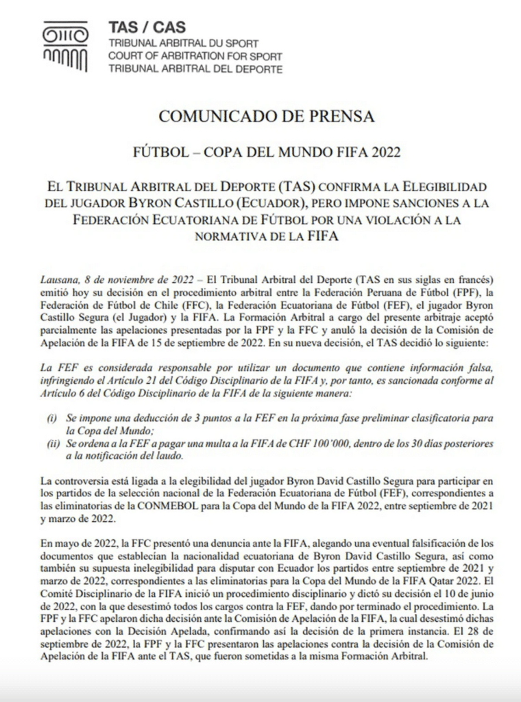 La decisión que tomó el TAS fue que Byron Castillo no podría jugar el Mundial para Ecuador y que la Tri empezaría la siguiente eliminatoria con un descuento de 3 puntos.