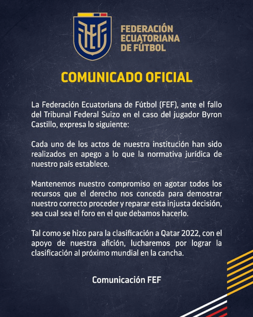 La Federacion Ecuatoriana conformó que el fallo del Tribunal Federal Suizo fue negativo en el caso de Byron Castillo. Ecuador seguirá jugando con -3 puntos.