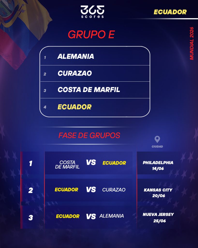 Tras el sorteo realizado el 5 de diciembre de 2025 en el FIFA Final Draw, la Selección de Ecuador ya conoce a sus rivales de grupo para la Copa Mundial 2026, que se disputará en Estados Unidos, México y Canadá.