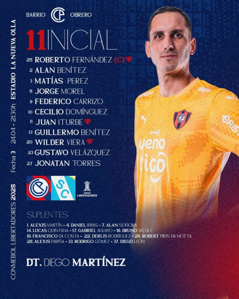Cerro Porteño hoy ha confirmado su alineación para el duelo de la tercera fecha de la Copa Libertadores ante Sporting Cristal en el Estadio ueno La Nueva Olla. Diego Martínez definió su equipo titular con importantes novedades. ¿Quién ganará?