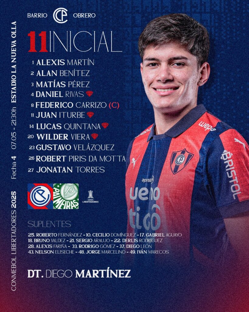 Cerro Porteño hoy ha confirmado su alineación para el duelo de la cuarta fecha de la Copa Libertadores ante Palmeiras en el Estadio la Nueva Olla de Asunción. Diego Martínez definió su equipo titular con importantes novedades. ¿Quién ganará?