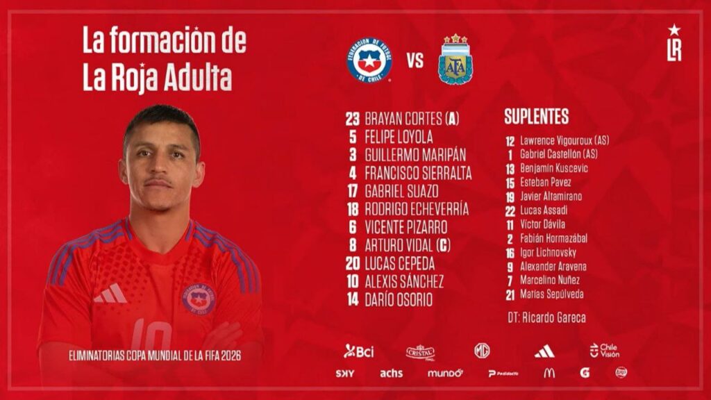 Chile hoy presentó su alineación titular para el determinante compromiso frente a Argentina por la jornada 15 de las Eliminatorias Sudamericanas rumbo al Mundial 2026. Ricardo Gareca apostó por su mejor once disponible en busca de una victoria que mantenga vivas las esperanzas de clasificación. En un duelo de máxima exigencia ante la campeona del mundo, La Roja se juega su última carta y deberá responder con carácter, convicción y contundencia en Santiago. ¿Quién ganará?