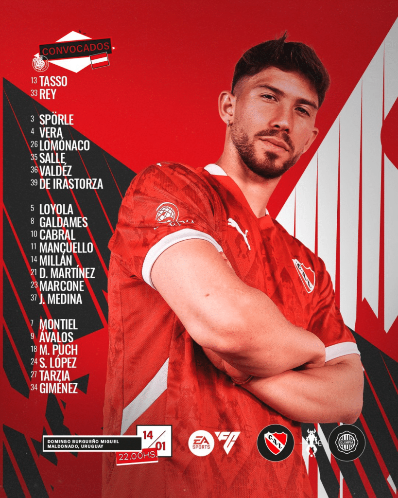 Julio Vaccari, técnico de Independiente, ha anunciado la lista de jugadores que viajarán a Uruguay para enfrentar a Olimpia de Paraguay en un encuentro correspondiente a la Serie Río de la Plata. El partido se disputará esta noche a las 22:00 horas en el Estadio Domingo Burgueño Miguel, en Maldonado, Uruguay, y será transmitido en exclusiva por Disney+.