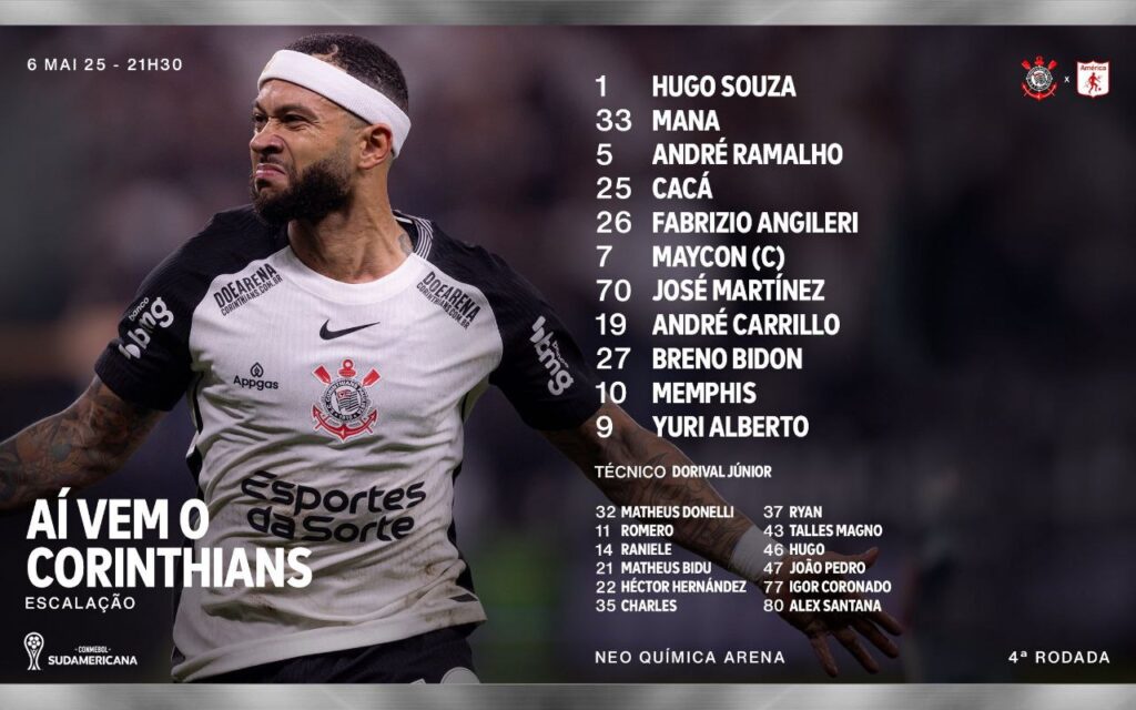 Corinthians hoy: alineación vs América de Cali por Copa Sudamericana