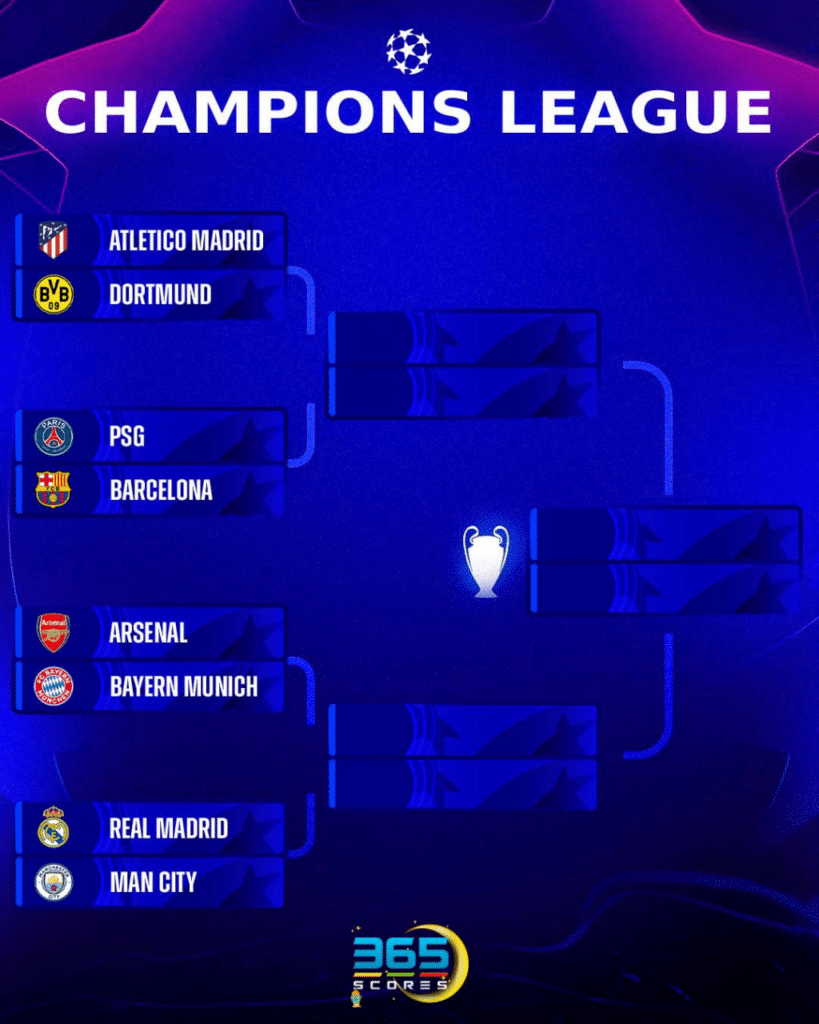 El ganador de Atlético Madrid vs Borussia Dortmund jugará vs PSG Barcelona y el ganador de Real Madrid vs Manchester City jugará vs el ganador de Arsenal vs Bayern Munich.