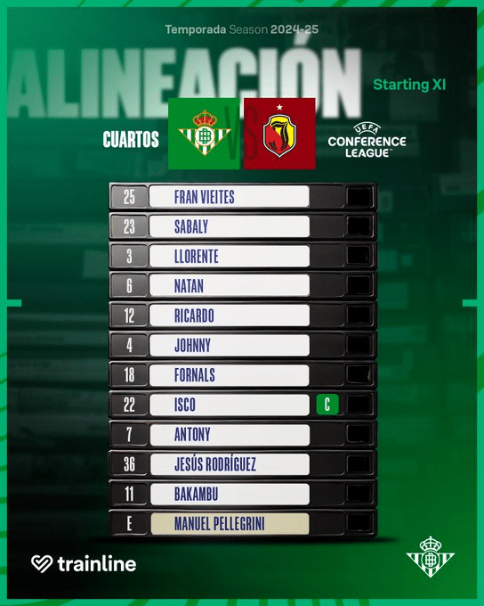 A pesar de la baja del colombiano, Manuel Pellegrini pondrá un equipo competitivo en busca de sacar ventaja en la serie. Estos son los titulares de Betis para el partido de hoy: