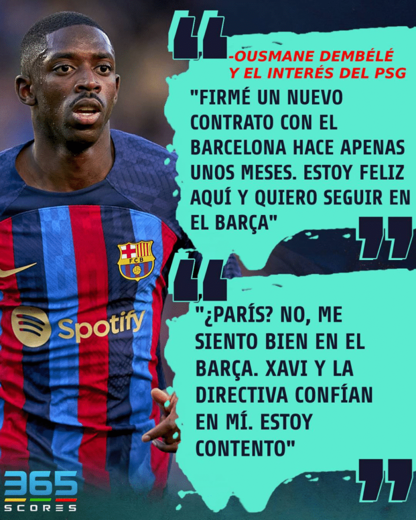 Desde el club tampoco parecen estar interesados en venderlo y el deseo es que pueda convertirse en la estrella a la que fueron a buscar. “Dembélé no está en venta. Es uno de los jugadores más importantes que tenemos. Es uno de los puntales que tenemos. Cada vez que juega, desborda. Es un rayo. Pero no está en venta ni por 70 millones ni por ninguna otra cantidad”, declaró Laporta sobre el jugador que tiene contrato hasta el 30 de junio de 2024.