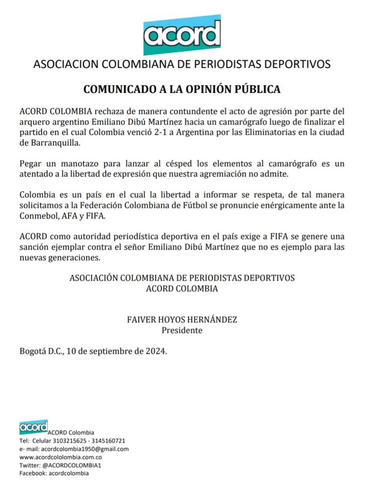“Pegar un manotazo para lanzar al césped los elementos al camarógrafo es un atentado a la libertad de expresión que nuestra agremiación no admite. ACORD como autoridad periodística deportiva en el país exige a FIFA se genere una sanción ejemplar contra el señor Emiliano Dibu Martínez que no es ejemplo para las nuevas generaciones”, publicaron.