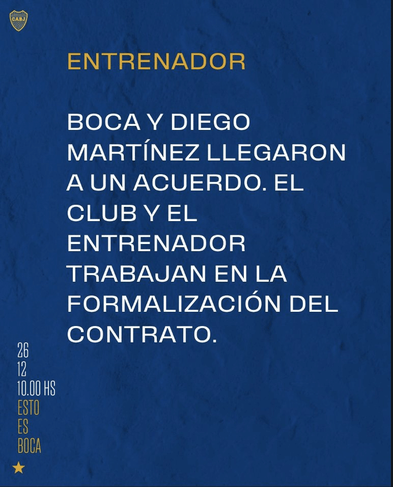 En sus redes sociales, Boca Juniors anunció que llegó a un acuerdo con Diego Martínez para convertirse en el entrenador del club de la Ribera.