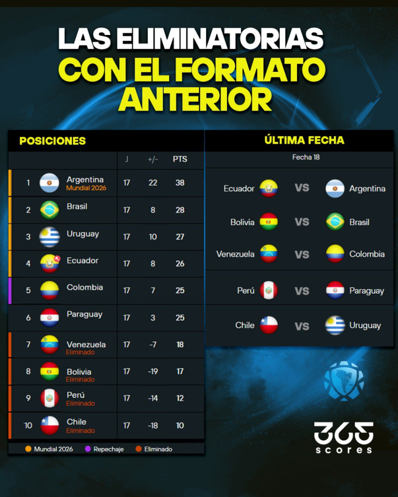 Con seis cupos directos, la clasificación ya está definida para Argentina, Brasil, Uruguay, Ecuador, Colombia y Paraguay. El repechaje se lo disputan Venezuela y Bolivia, lo que le da emoción a la fecha 18, aunque en un contexto más accesible que el de las Eliminatorias pasadas.