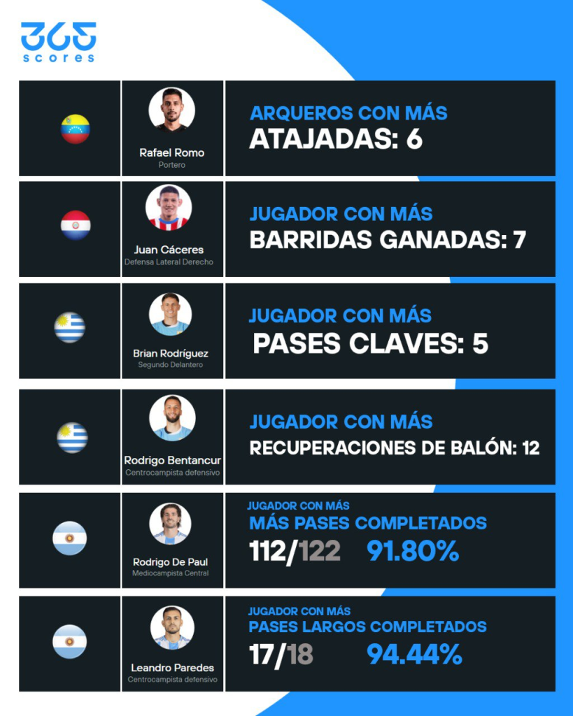 | Pases completados | Rodrigo De Paul | Argentina | 112/122 (91.8%) |