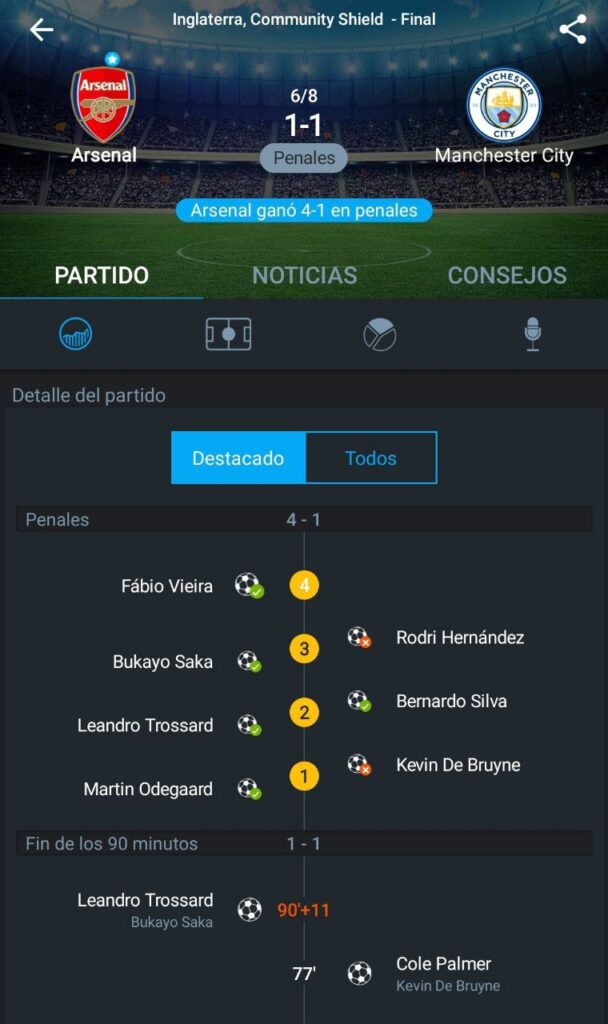 El Arsenal de Mikel Arteta le ganó por penales al Manchester City de Pep Guardiola, en el primer partido oficial de la temporada inglesa y se quedó con la final de la Community Shield en el mítico estadio de Wembley, competencia que enfrenta al campeón de la Premier League con el campeón de la FA Cup.