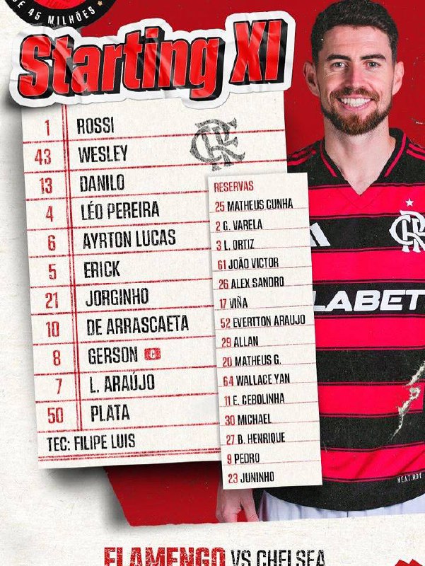 Estos son los once iniciales que dispone Filipe Luis para el segundo encuentro del Flamengo en este Mundial de Clubes 2025, enfrentando nada más ni nada menos que al Chelsea, por el Grupo D.
