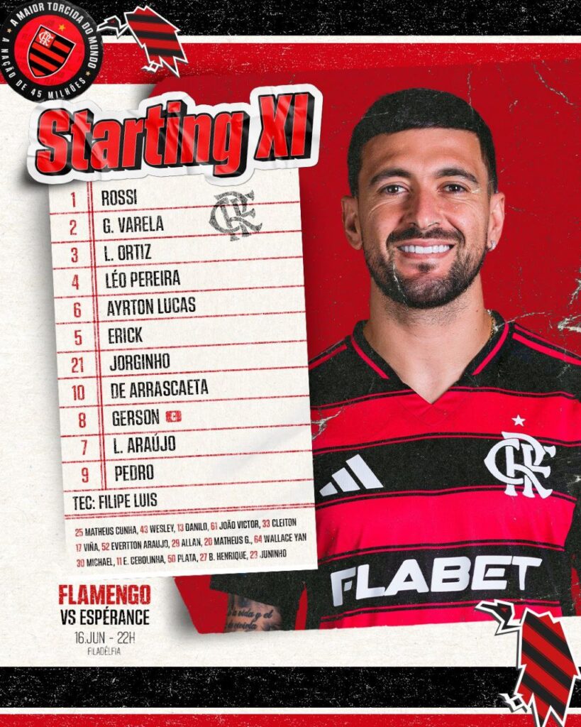 Flamengo hoy enfrenta hoy un estreno desafiante en el Mundial de Clubes 2025 ante el aguerrido Espérance de Túnez, en el comienzo del Grupo D. El conjunto brasileño, uno de los grandes candidatos al título, llega con una plantilla repleta de talento y con la expectativa de imponer condiciones desde el primer partido. Para este cruce, el técnico opta por un once inicial ofensivo, que mezcla jerarquía individual, dinamismo por las bandas y solidez en la mitad del campo.
