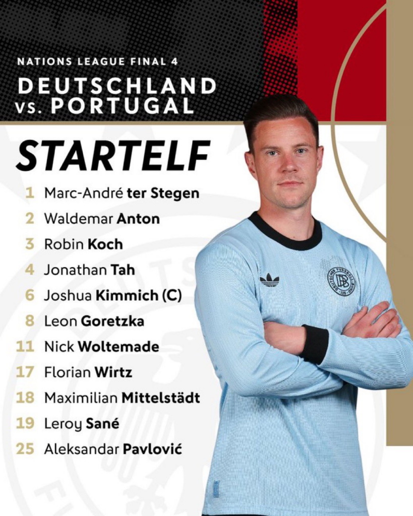 Julian Nagelsmann escoge un esquema de 4-2-3-1 para enfrentar a Portugal en el Allianz Arena de Múnich. Quieren ganar el título en sus tierras, por lo que tienen la obligación de ganar.