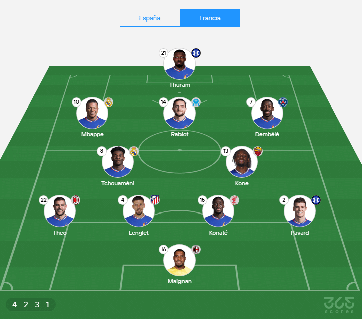 - Defensores: Benjamin Pavard, Ibrahima Konaté, Clément Lenglet, Theo Hernández.