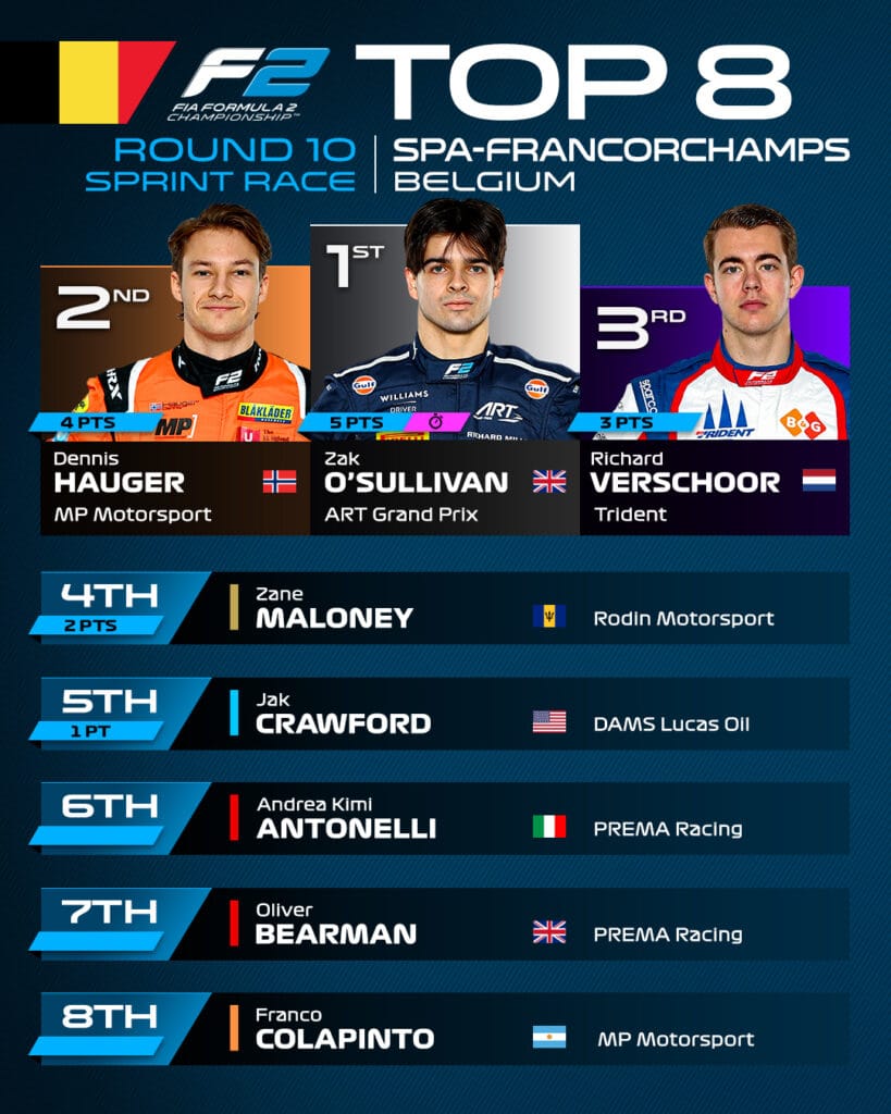 El nacido en pilar largó en la cuarta posición pero le costó mantenerse en ese lote. Perdió posiciones en la largada inicial hasta que la lluvia se llevó la escena final. Al ver que el circuito estaba peligroso y con muchas complicaciones para los jóvenes pilotos, se decretó la bandera roja y la suspensión final de la Sprint Race. Una tarde-noche mala y casi sin acción en tierras belgas.