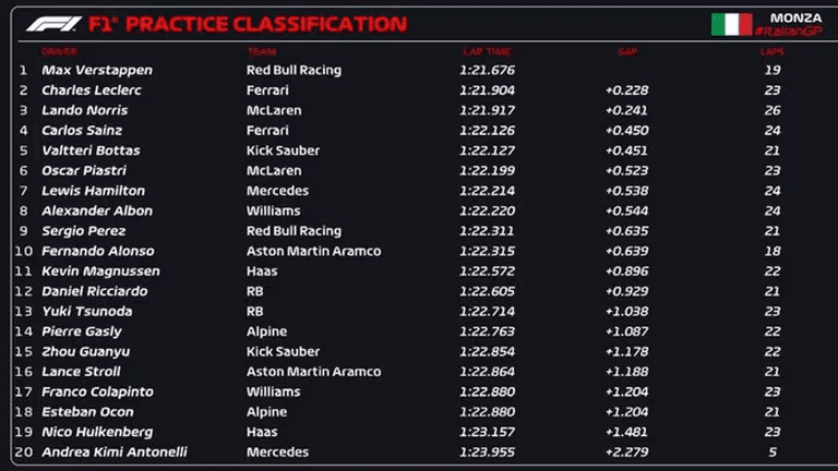 En la primera participación oficial de un argentino en la Fórmula 1 tras 23 años (el último había sido Gastón Mazzacane en 2001), Franco Colapinto participó, con un buen nivel para ser su segunda vez en una primera práctica de la máxima categoría, de la FP1 y la FP2 del Gran Premio de Monza, un circuito que le trae buenos recuerdos de su pasado en otras categorías.