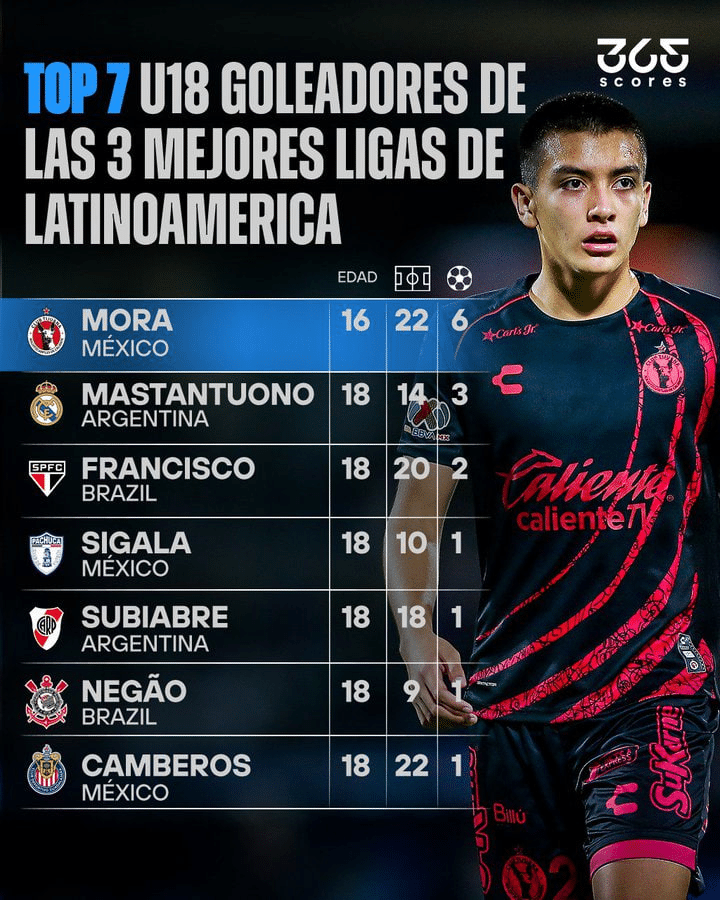 Mora juega para el Club Tijuana de la Liga MX, y ya con 16 años ha mostrado una capacidad de adaptación impresionante. Su cifra de 6 goles en 2025, ante rivales de mayor experiencia física y ritmo competitivo, lo posiciona como uno de los talentos más precoces de la región.