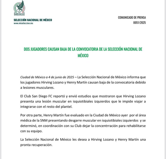 Por otra parte, Henry Martín fue evaluado en la Ciudad de México ayer por el área médica de la SNM presentando desgarre muscular en isquiotibiales izquierdos y se determinó, en coordinación con su Club, dejar la concentración para rehabilitarse con su equipo.”