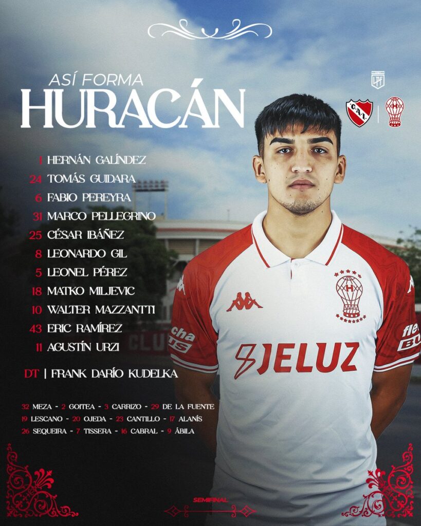 Huracán hoy visita a Independiente en busca de un pasaje rumbo a Santiago del Estero, para poder disputar la gran final de este Torneo Apertura 2025. El Globo va hasta el Libertadores de América con sus mejores hombres y su entrenador Frank Kudelka ya definió los once. ¿Quién ganará?