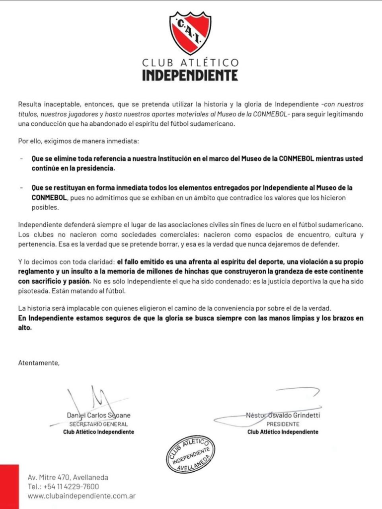 - “Que se restituyan de forma inmediata todos los elementos entregados por Independiente al Museo de la CONMEBOL”.