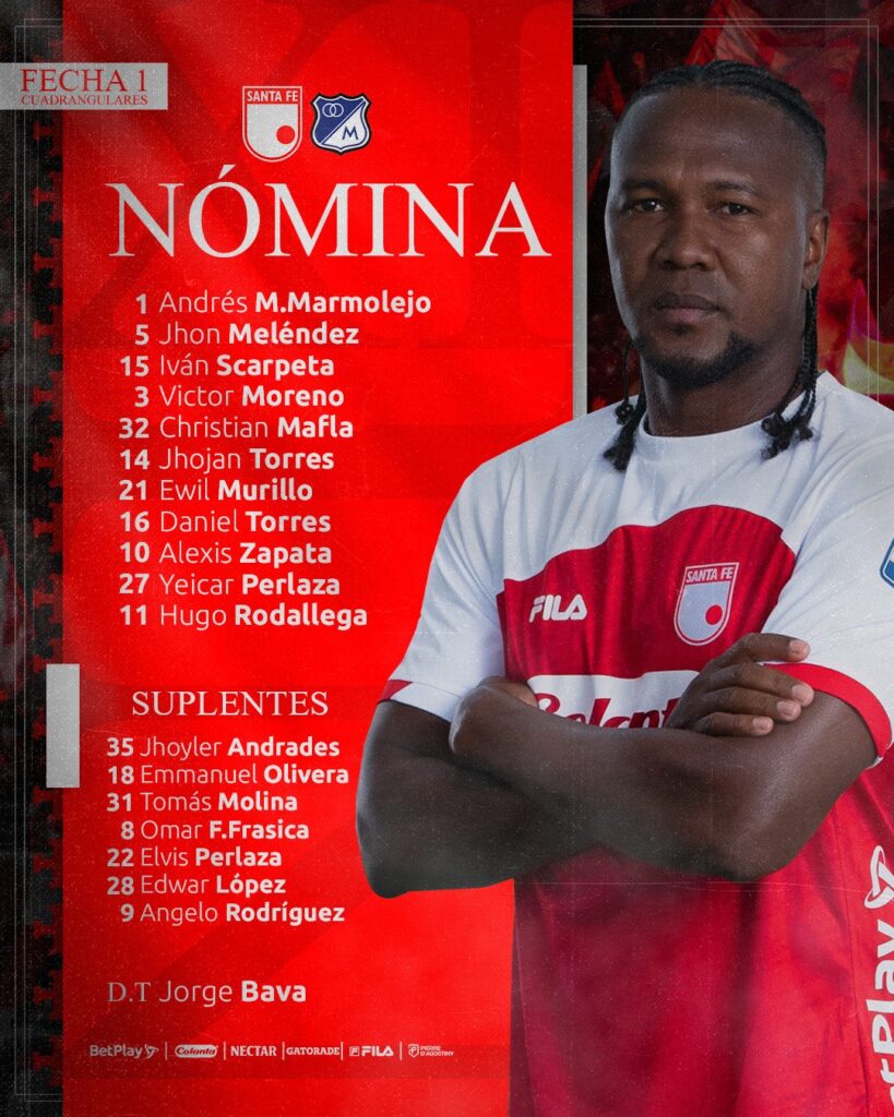 Independiente Santa Fe hoy comenzará su camino al título de la Liga BetPlay Dimayor. A través de los Cuadrangulares, el equipo bogotano enfrentará a Millonarios en un duelo especial para ambos equipos. ¿El objetivo? Ganar el clásico y acomodarse en la tabla de posiciones. Conoce los XI titulares para este encuentro.