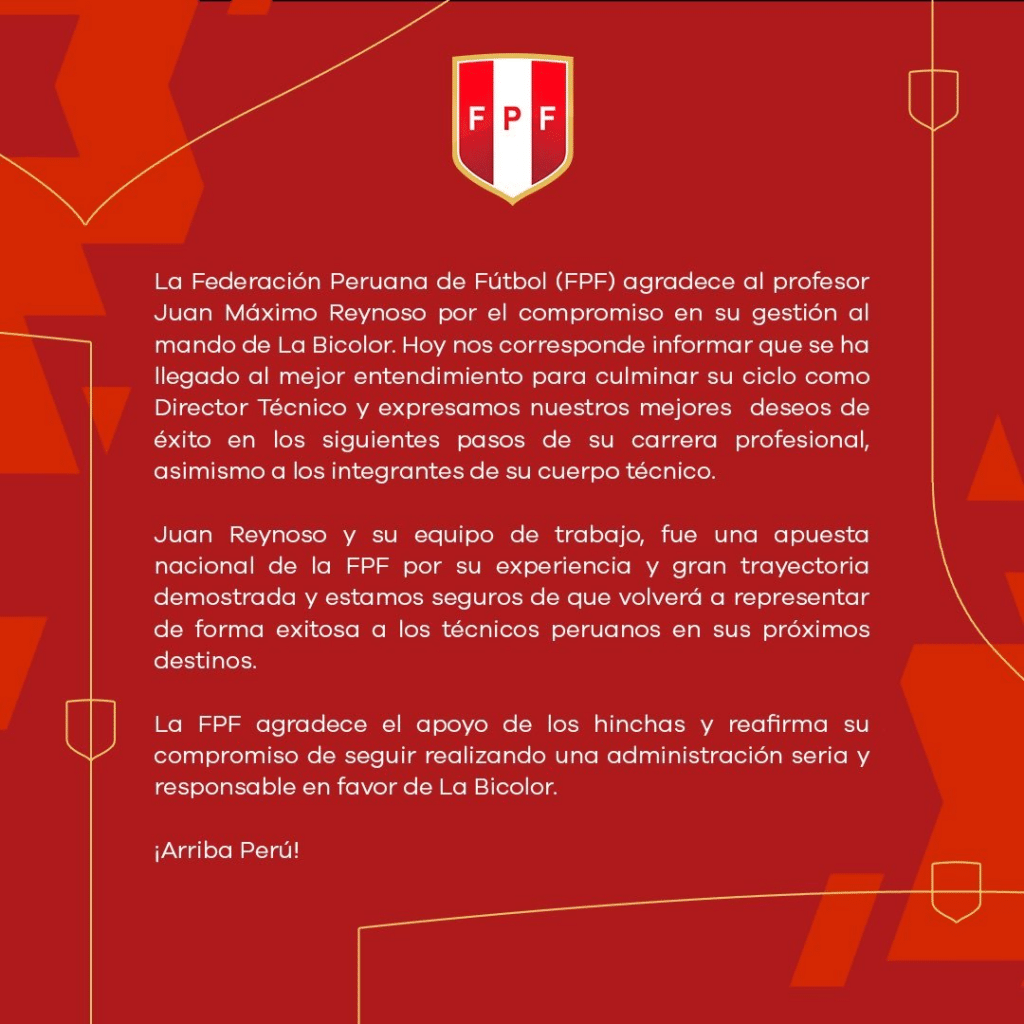 “La FPF agradece al profesor Juan Máximo Reynoso por el compromiso en su gestión al mando de la Bicolor. Hoy nos corresponder informar que se ha llegado al mejor entendimiento para culminar su ciclo como Director Técnico y expresamos nuestros mejores deseos de éxito en los siguientes pasos de su carrera profesional”, comunicó la Federación