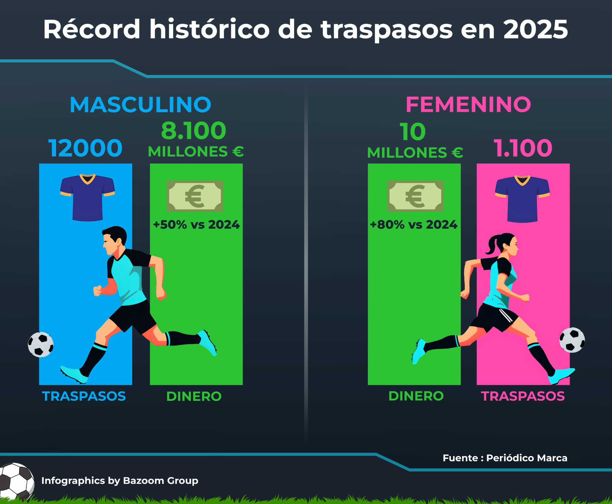 El mercado de fichajes en 2025 rompió récords económicos. Según un estudio realizado por un periódico español, este año hubo 12.000 traspasos masculinos con 8.100 millones de euros gastados y en el fútbol femenino 1.100 movimientos y 10 millones invertidos.