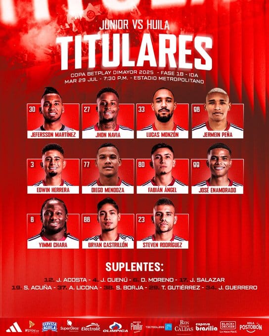 Estos son los XI titulares del Junior hoy, que saldrán al campo de juego por la segunda ronda de la Copa Colombia 2025: