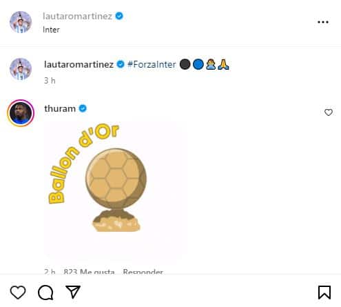 En un posteo que hizo el delantero y capitán del Inter este viernes por la tarde en el cual muestra su vuelta a los entrenamientos con el conjunto italiano, su compañero de ataque, el francés Marcus Thuram, comentó con un gif que dice “Ballon d´Or” haciendo referencia a que el jugador de la Selección Argentina debería quedarse con el galardón a mejor jugador del año entregado por el prestigioso diario France Football.