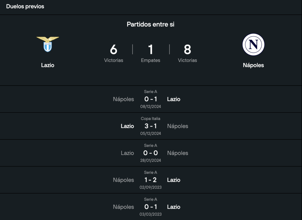 El historial de Napoli ante Lazio es bastante amplio en la Serie A. En 365Scores podrás encontrar todos los enfrentamientos directos entre ambos equipos: