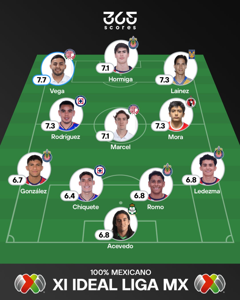 Un XI de Liga MX que demuestra calidad, juventud y presencia, con nombres como Richard Ledezma, Marcel Ruiz, Gilberto Mora, Alexis Vega y Armando González.