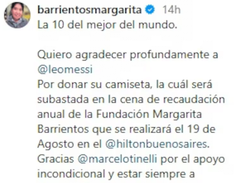 “La 10 del mejor del mundo. Quiero agradecer profundamente a Leo Messi por donar su camiseta, la cual será subastada en la cena de recaudación anual de la Fundación Margarita Barrientos que se realizará el 19 de agosto en el Hotel Hilton de Buenos Aires. Gracias Marcelo Tinelli por el apoyo incondicional y estar siempre a disposición”, publicó Margarita Barrientos en sus redes sociales. Y posó con la camiseta que donó el 10.