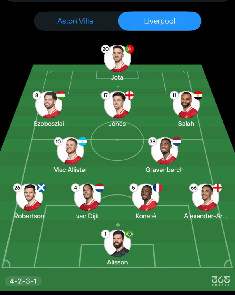 El entrenador del Liverpool, Arne Slot, optó por realizar algunas modificaciones en el equipo titular, apostando por la rotación debido a la carga de partidos. Luis Díaz, quien venía siendo titular en los últimos tres encuentros de los ‘Reds’, no estará desde el inicio contra Aston Villa, dejando su lugar a Diogo Jota en la delantera.