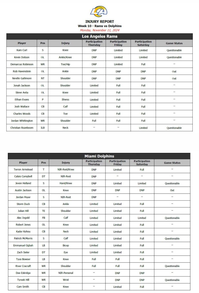 ¿Cuáles son las posibles bajas que tendrán Los Ángeles Rams vs Miami Dolphins para el Monday Night de la NFL?