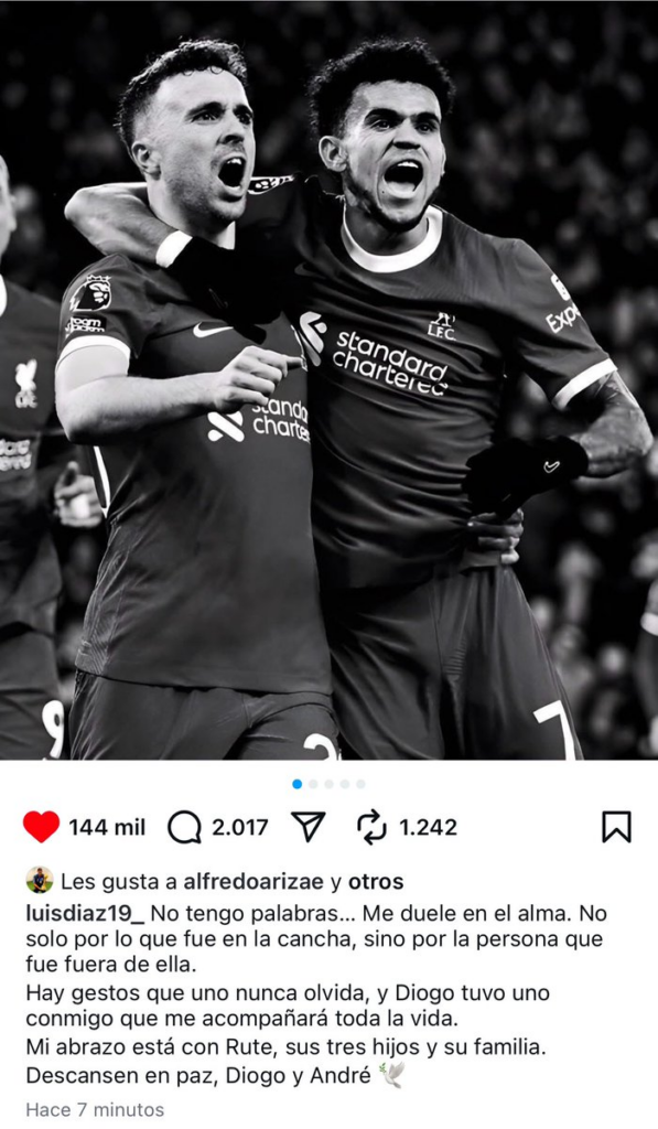 El mundo del fútbol está de luto tras confirmarse la muerte de Diogo Jota en un accidente de tránsito. La noticia conmocionó a compañeros, hinchas y especialmente a quienes compartieron vestuario con él. Uno de los mensajes más emotivos fue el de Luis Díaz, quien recordó el gesto inolvidable que el portugués tuvo con él en uno de los momentos más difíciles de su vida.