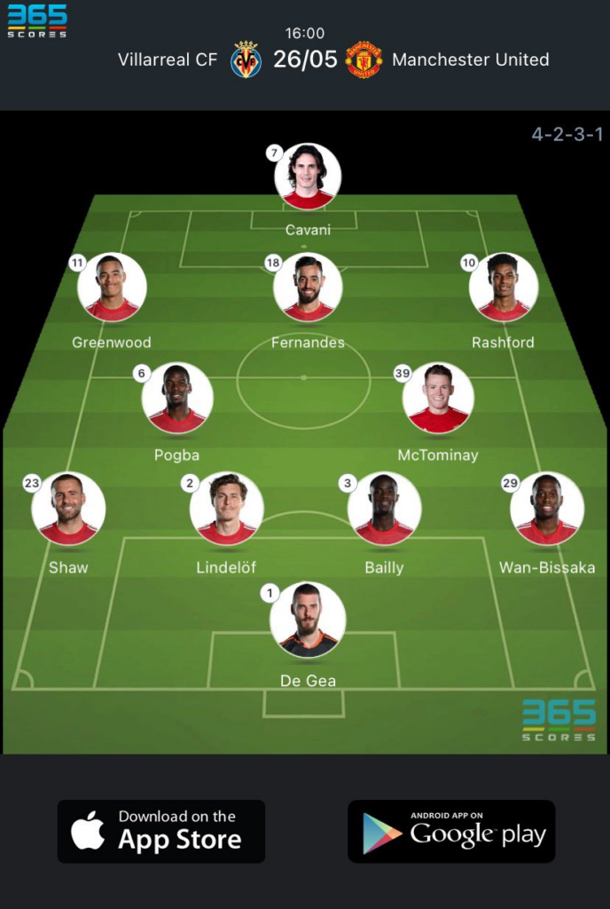 - Goles: Gerard Moreno (Villarreal), Edinson Cavani (Manchester United)