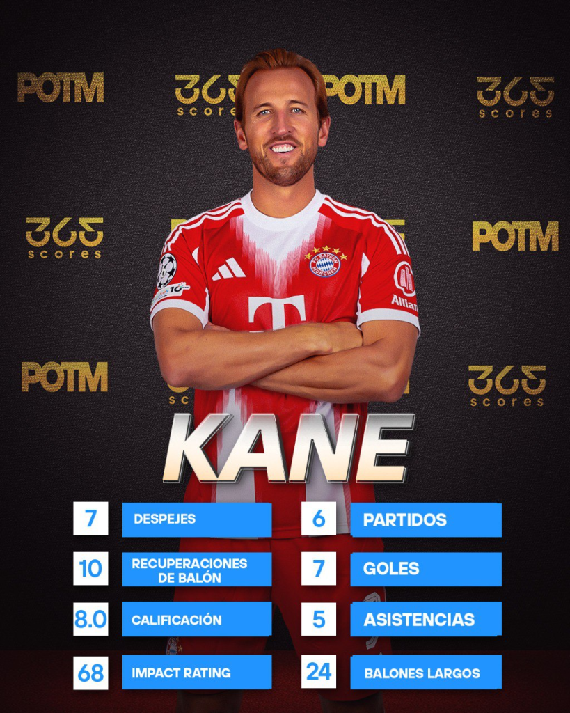 El capitán inglés sigue siendo determinante en el Bayern. En seis encuentros anotó siete goles, participando en casi todos los triunfos de su equipo. Su rendimiento fue especialmente destacado en los partidos ante Colonia (4-1) y Letonia (5-0) con la selección inglesa, donde firmó dos dobletes.